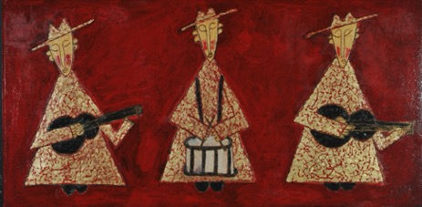 I paint my stories on tarpaper (or roofing felt) and use wood putty, house paint, and acrylics as my medium. Sometimes I will paint a story 60 feet in length on a roll of tarpaper and then cut it into smaller "palm of the hand" stories. I am a self-taught artist who believes a paint brush fell out of the sky and landed in my hand at an important turning point in my life, and through my art, I try to bring that invisible state of bliss that exists in us all to the surface.