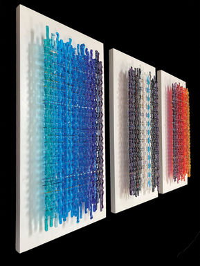 My Linen Collection consists of a series of woven glass sculptures that are crafted using colored glass ribbons that are hand-cut from large pieces of sheet glass. I lay out my compositions and create accents to my ribbons with strings of color from the subtle to the unexpected. I often use a touch of dichroic glass for extra sparkle. I bend and weave my ribbons using the heat from my kilns and then mount my woven sculptures so that they appear to float towards the viewer.