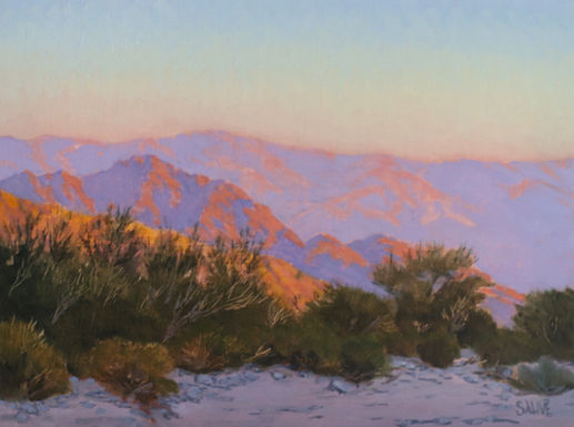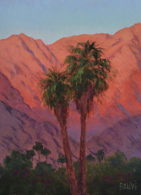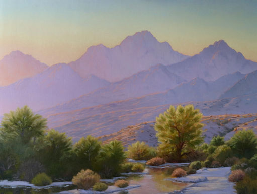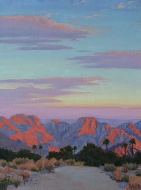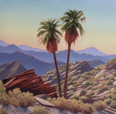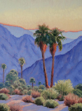 The collection of paintings I will be showing reflects a deep love of the desert--specifically the areas close to La Quinta and the Coacella Valley. The new paintings are mostly sourced from my early morning hikes in La Quinta Cove and also Indian Canyon. Hiking in the cove in the spring I walked through what clearly was an arroyo of sorts where water had flowed and disappearred. In a couple of my new pieces I imagined the water to be there, reflecting the gorgeous flora, mountians and sky.